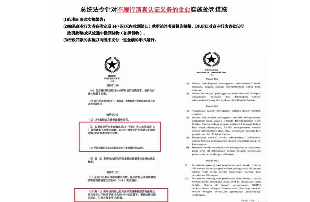 若企业没有持有清真BPJPH官方清真证书,则无法通过印尼海关,或者已经进入印尼但没有及时补充BPJPH 证书的,将面临政府处罚。